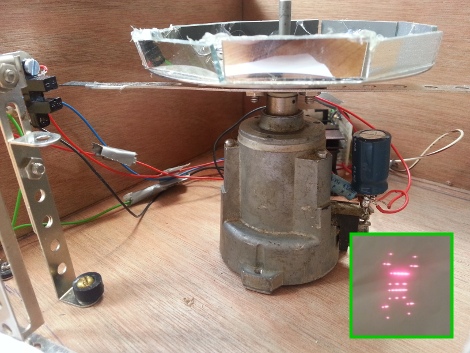 16 × 8 pixeles proyector láser [ Michiel ] nos dio una pequeña nota de salida por el dibujo de la insignia con metaltech su recientemente completado 16 × 8 píxeles proyector láser . Se utiliza un conjunto de hilado de espejos montados en ángulos ligeramente diferentes para redirigir la trayectoria del diodo láser rojo El proyector es accionado por un Arduino . Este tipo de pantalla hilado es uno de los pocos métodos comunes para la fabricación de proyectores láser Vea estos interesantes articulosINICIO --------------------------------------------------------------------------------------------------------------------------- |
