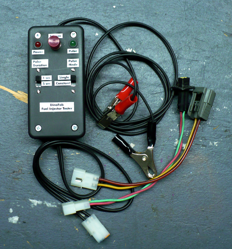 Para usarlo [ Dino ] se conecta a un suministro de banco de 12 V y para el inyector , con un solo botón para iniciar la prueba .