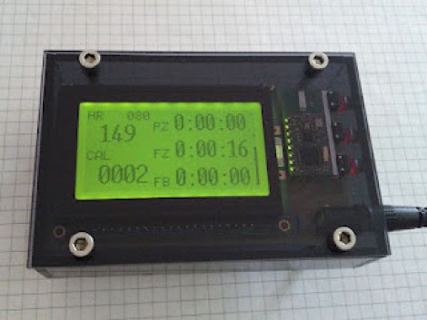 Esta es la lectura que [ Remick ] añadido a su bicicleta estática. Se muestra la frecuencia cardíaca, calorías quemadas , y algunas otras cosas para ayudar a motivar a su rutina de ejercicios .