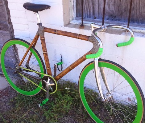 Imágenes de usuario [ tkgarrett101 ] recientemente acabó con costosos materiales exóticos para su cuadro de la bicicleta y optó por una forma un poco menos elaboradas de material de construcción natural, bambú ! La bicicleta se compone de una estructura metálica bicicleta normal con una mayoría de las vigas estructurales cortadas y se reemplaza con postes de bambú . El bambú se debe quedar ajustado por primera vez con un poco de pegamento gorila ampliando luego atados con una cuerda en su lugar de cáñamo y resina de fibra de vidrio . En lugar de correr los cables a lo largo del cuadro de la bicicleta tiene descansos montaña y un concentrador de dos velocidades , también conserva la mirada simplista de todo el conjunto . [ tkgarrett101 ] dice que su moto no es tan barato , el costo de las piezas en general fue de alrededor de 800 dólares (USD) ! Además de que pesa mucho para un equipo fijo . Además, la alineación es un poco fuera de la tija del sillín