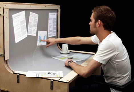 BendDesk multi-touch muebles El BendDesk es una horizontal y una vertical multi-pantalla táctil conectada como una superficie curvada. El sistema utiliza una combinación de dos proyectores que brilla en la superficie de debajo y por detrás. Vea estos interesantes articulosINICIO --------------------------------------------------------------------------------------------------------------------------- |