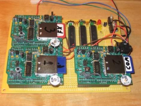 Como se puede ver arriba, hay tres ATMega328 chips que ejecuta el gestor de arranque Arduino y cada interfaz con uno de los tres escudos verdes WAV.