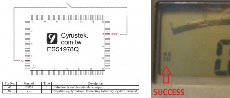 Uno de los pines permite una salida de pulsos de serie cuando baja. Tocar a V-incluso se convierte en un icono RS232 en la pantalla, como se ve arriba. Para hacer este acceso sin necesidad de abrir el caso puede ser un botón pulsador momentáneo añadido, así como conector para la salida de la señal, y un poco de análisis sobre el lado del PC para manejar los datos entrantes