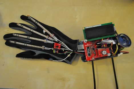 equipo se dispuso a alejarse de las palabras estrictamente ortografía, a la combinación de firmar con gesto común. El proyecto se basa en un Arduino Mega y se limita al alfabeto y alrededor de diez palabras, debido a las restricciones de espacio inicial de programación. Cuando los cinco sensores de flexión y tres valores acelerómetro registra un estado de reposo durante dos segundos, el dispositivo tiene una lectura y busca la palabra más probable o carta en la mesa. A continuación, resultados que a uno escudo buzón de voz para traducir las palabras o letras en sonidos fonéticos