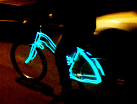 En su lugar, decidió que su bicicleta de alambre EL sería alimentada únicamente por el piloto. En aras de mantener las cosas verdes, toda la construcción se compone de piezas de re-propuso, además del cable EL sí mismo.