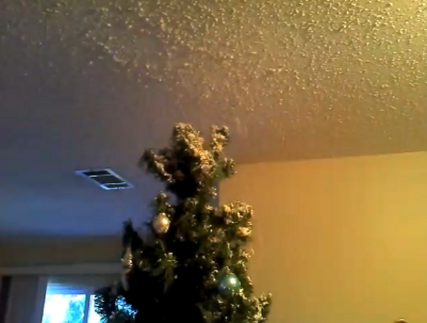 Miró a su alrededor de la casa y vino para arriba con todo lo necesario para que esto suceda con un árbol de Navidad. La nieve es de espuma de poliestireno sueltos como lo que encontraría en una silla del bolso de haba. En la parte inferior del árbol hay un paraguas invertido para recoger la nieve y el embudo en un ventilador rescatado de un adorno de Halloween silla inflable. El soplador de los brotes de la espuma de poliestireno a través de un tubo de PVC, que también sirve como el tronco del árbol falso, y que surge de la parte superior trayendo alegría navideña a una sala de otra manera tranquila.