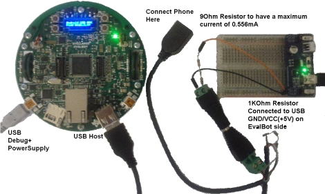 Para conseguir su teléfono de trabajo con el EvalBot , él también tenía ajustar la fuente de alimentación externa de corriente USB para proporcionar la corriente necesaria para funcionar correctamente con otros dispositivos USB conectados a hardware