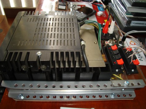 Después de un poco de las pruebas, se desprendió un relé atascado y se propuso el uso de estos amplificadores un sistema de audio. Agarró una cierta izquierda sobre los soportes de montaje de su TV y los utilizó como el ferrocarril monturas. En la parte posterior telegrafió conectores estándar de altavoces y los conectores RCA para el cable de alimentación para los amplificadores. El aspecto final es encender el dispositivo, por la que usaba su fuente de alimentación ATX modificado previamente como una prestación banco. 130-W de potencia por el costo de una de conectores.