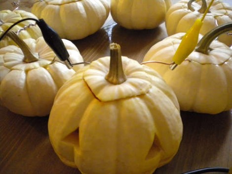 Halloween Props : la baterÃa de calabaza Esto se podría hacer un centro agradable para su fiesta de Halloween. Cada calabaza se necesita un par de conductores de metales diferentes para servir como el ánodo y el cátodo . Vea estos interesantes articulos