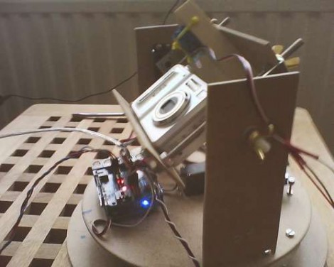Tenemos grandes visiones de ser capaz de producir algo en la línea de estas impresionantes imágenes interactivas con el hardware que es más barato y más fácil de construir que este equipo otros motorizados . El diseño utiliza dos servomotores . En la imagen de arriba puedes hacer un par de discos que sirven de base para la plataforma . En el centro del disco superior es el servo en primer lugar, apuntando hacia abajo , lo que hace girar la cámara . Dos perfiles verticales a cada lado de la de apuntar y disparar proporcionan el marco para la función de inclinación . La cámara se monta en un marco cuyo centro es una varilla roscada en el lado cercano , y el motor servo de segundo en el otro lado