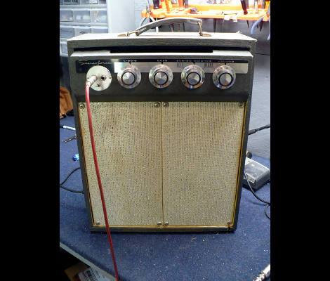 La versión de amplificador de guitarra se sienta en el caso extremo, el cual funciona a la perfección desde el asa de transporte está en la parte superior .