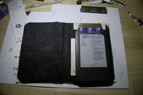Hay dos bolsillos en la parte superior del lector Kindle de ganchos para agarrarse. Cada uno tiene un contacto eléctrico en ella y juntos proporcionan alrededor de 4V de poder.