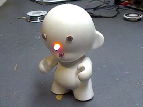 Aplicar todos los componentes en un pequeño juguete de plástico, en sustitución de los ojos y la boca de la muñeca con tres células fotoeléctricas, y el canje de la nariz hacia fuera para un LED brillante. Cuando la luz golpea las células foto, un chillido fuerte agudo se emite, y el LED parpadea con furia hasta que la fuente de luz se retira. blindar el dispositivo de la luz hará que tanto el sonido y el LED de frenar, pero el brillo de los LED garantiza que el juguete todavía hace ruido cuando está cubierta