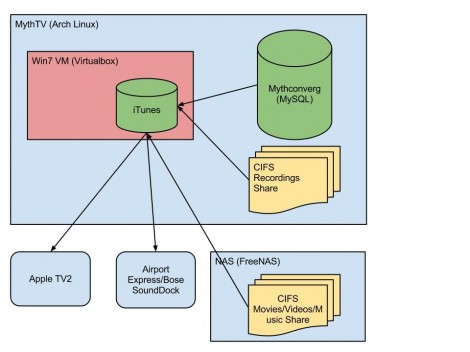 [ Dan ] escribió para compartir un enlace a su MythTV a Apple configuración de la TV . Él encontró una manera de hacer las grabaciones que realizó en su máquina Linux está disponible en la 2 ª generación de Apple TV. Nuestro primer pensamiento es que iba a usar XBMC en un dispositivo de jailbreak pero que no es el caso . El secreto consiste en lanzar iTunes en la mezcla. Mira el diagrama anterior. El sistema comienza con un cuadro de Arch Linux que se ejecuta MythTV , un programa de código abierto que le permite grabar desde el sintonizador o hardware codificador . Pero, en realidad viendo las grabaciones en un dispositivo iOS es difícil para un par de razones . En primer lugar, Apple le gusta mantener sus dispositivos bajo llave apretada con la esperanza de que usted compre su entretenimiento en lugar de velar por el aire registros. En segundo lugar, si está grabando los canales de ATSC de los archivos puede ser 1080i o 1080p , ninguno de los cuales pueden ser manejados por el Apple TV 2