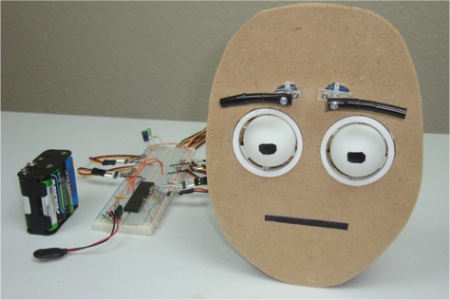 Utilizando bolas de ping-pong , un poco de plástico de desecho y 6 servo motores [ Chris ] ha creado estos ojos animatronic , junto con algunas cejas animado ingenioso .