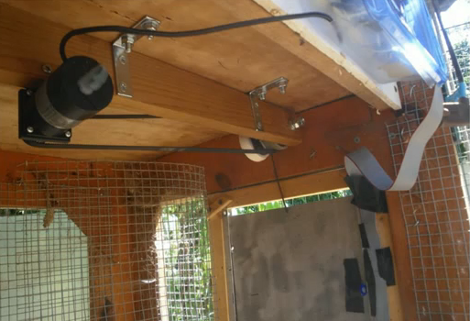 [ Larry ] y [ Carol ] acaba de actualizar la cooperación para hacer la vida más fácil , y para ayudar a mantener a las gallinas felices. La imagen de arriba es un chicken's -ojo- vista de la puerta que acaba de instalar automáticamente . Es un diseño de guillotina que utiliza el peso de la puerta de chapa de aluminio para que los depredadores que no pueden entrar por la noche. Esto es mucho más fácil de fabricar que una puerta de cooperación bloqueo habría sido . Algunos restos de guías de aluminio de la puerta del canal a ambos lados , con un carrete por encima de él para cerrar una cuerda , con lo que el levantamiento de la puerta. Usted puede ver el motor de transmisión por correa también se monta en el interior , fuera del elemento . A la derecha de la imagen que acaba de hacer a un recipiente de plástico para alimentos . Esto protege la electrónica de los elementos