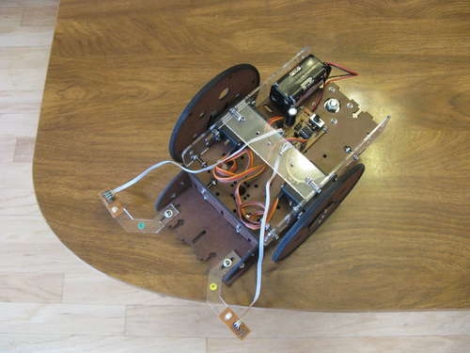 El pequeño servo - conducido robot utiliza sensores de borde simple para asegurarse de que no se cae en una superficie elevada . Los sensores fueron construidos usando un pequeño LED IR y el transistor de la foto , que está parcialmente aislada de la luz de un trozo de tubería de encogimiento . Un ATiny micro - controlador tiene dos mediciones de la cantidad de luz IR de entrar en el transistor de la foto - uno con el LED , la otra con el LED apagado . La diferencia de estas mediciones se comparan para determinar si los sensores de borde están colgando del lado de la mesa