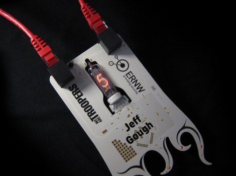 Los deportes insignia de un centro de montaje de tubos Nixie que se utiliza para mostrar el puntaje de los asistentes . Se usa alrededor del cuello con un cable Cat-5 , que actúa como una correa de cuello y sirve como un interruptor de alimentación de la placa . La placa puede ser conectado a un programador especial utilizado por los organizadores de la conferencia , que actualiza la puntuación de los asistentes después de completar cada actividad