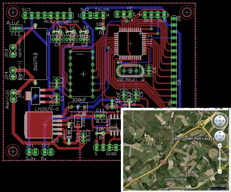 aventuras y excursiones. Un PIC 18F2550 lee ubicación y datos de altitud de un receptor GPS, así como los datos de un acelerómetro. Esta información se puede visualizar en una pantalla táctil adjunto y también se guarda a un par de EEPROM. Cuando vuelva de su viaje, los datos extraídos de el dispositivo a través de una conexión en serie es procesado por [Jeroen